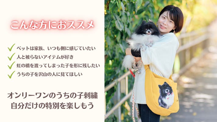 「Makuake(マクアケ)」は、実行者の想いを応援購入によって実現するアタラシイものやサービスのプラットフォームです。このページは、 ファッションカテゴリの 「ペット写真を刺繍で再現!いつも、どんな時も一緒に【うちの子刺繍ショルダーバッグ】」プロジェクト詳細ページです。