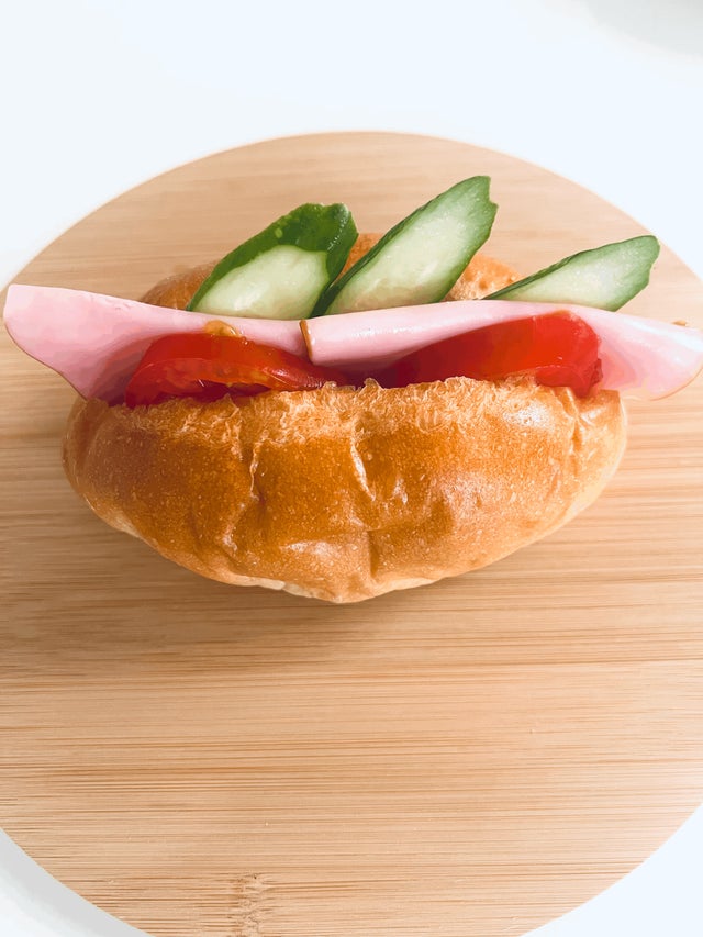 『魔法のパン』にちょっと手間をかけて、ハムサンドの出来上がり! こちらも誰も見ていないからそのままカブリついちゃいましょう!