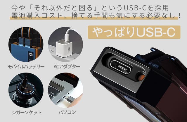 - 光は多場面で使える8種類から選べる。USB-Cポート搭載で電池交換は不要。