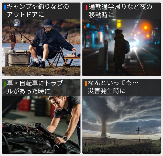 防塵防水性能はIP65。粉塵を完全にガードし、多少の雨に当たっても問題なく使用できます。キャンプや夜釣りのおともに。