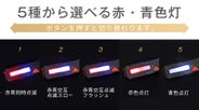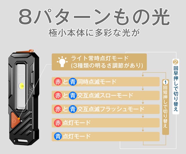ボタンを1回押すごとに光の強さ・種類が切り替わります。白色灯と赤・青色灯間の切り替えはボタンの早押し2回で行えます。