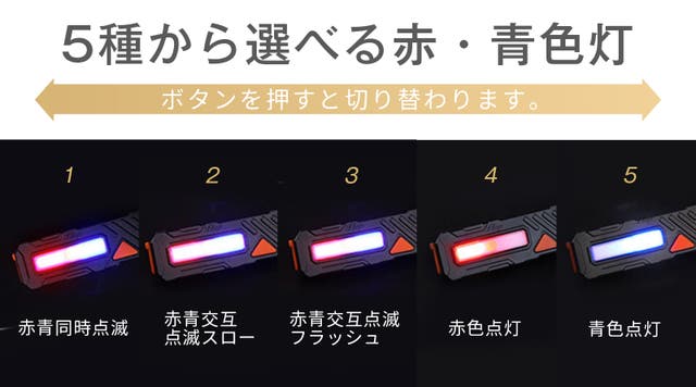 夜道で後方から来る車両に自分の存在をアピールしたい時、愛犬と夜の散歩に出かける時、身動きが取れない緊急時にうってつけなのが、赤青同時点滅モードです。