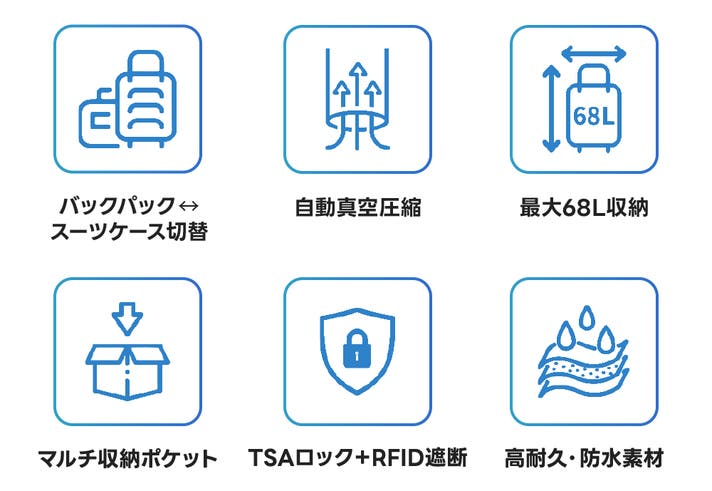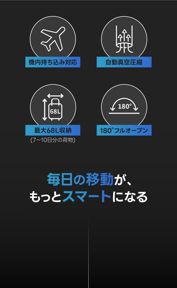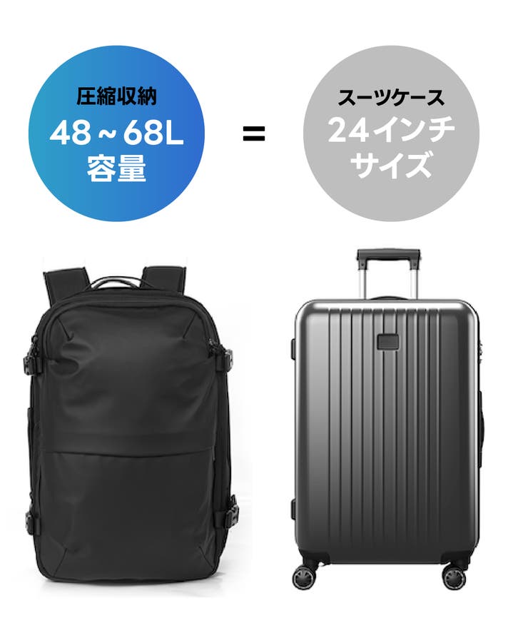 この商品は、バックパックとスーツケースを自由に切り替えて使える2WAY設計です。 ボタン1つで自動真空圧縮ができ、荷物が多い時でもスリムにまとめられます。