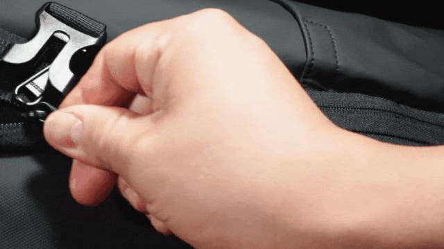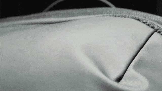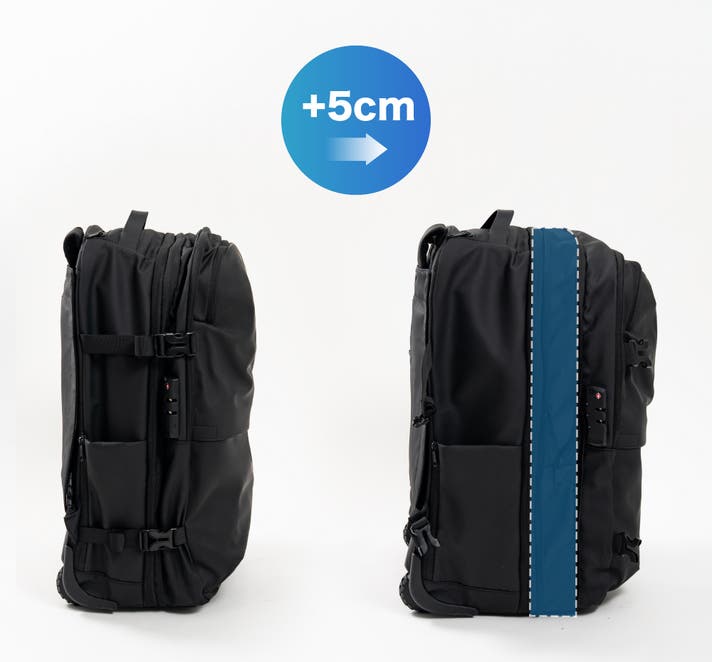側面のファスナーを開くと、隠れた収納スペースが5cm拡張され、荷物が増えた時でも余裕を持って対応できます。