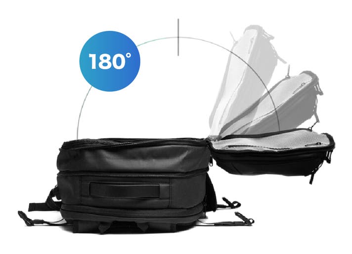 CANZ AIR バックパックは、メイン収納スペースが180°開く構造のため、 中身を一度に見渡せて、必要なものをすぐに取り出すことができます。