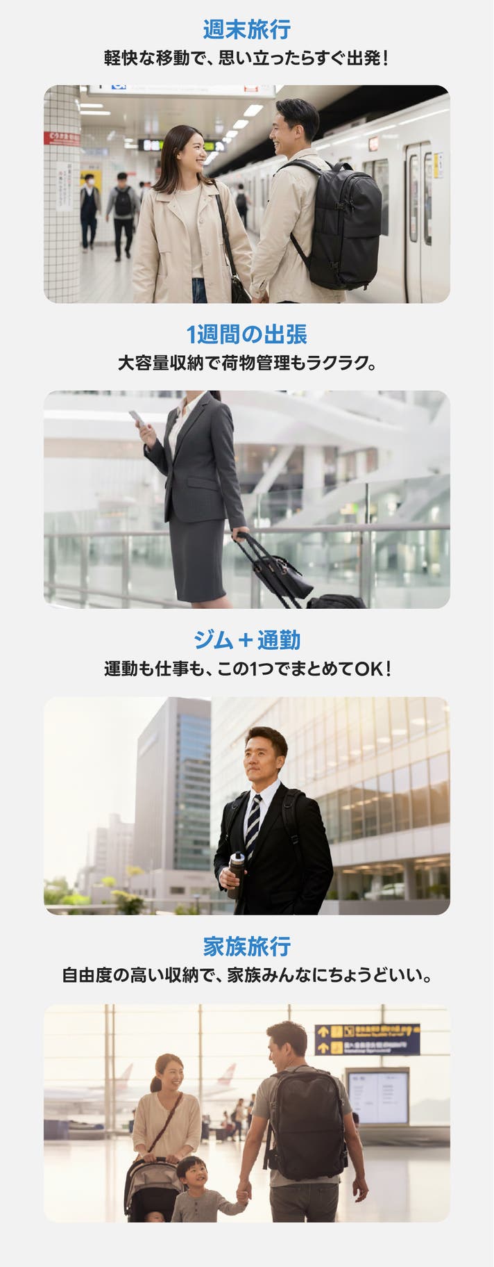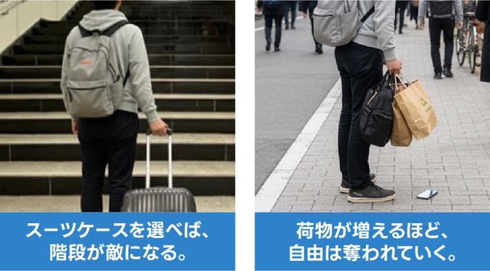 複雑な都市の街並みや階段では、バックパックとして負担なく移動でき、空港ではスーツケースに切り替えて、長い動線でも快適に歩けます。