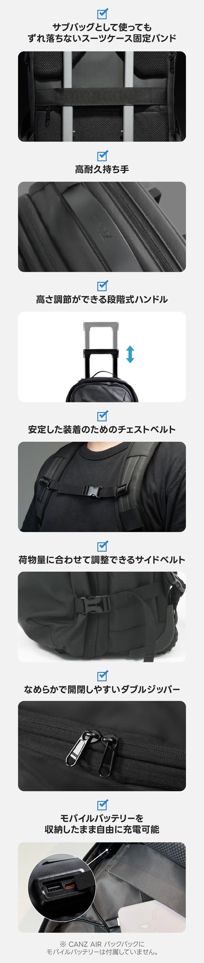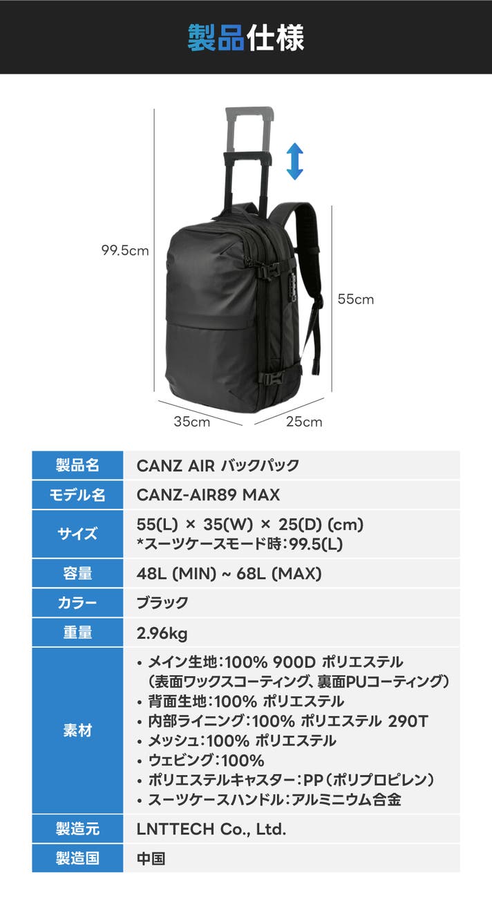 移動距離やシーンに合わせて、バックパックとスーツケースをいつでも切り替えることができます。複雑な都市でも、初めての旅先でも、CANZ AIR バックパックで、あなたの移動を思い通りに。