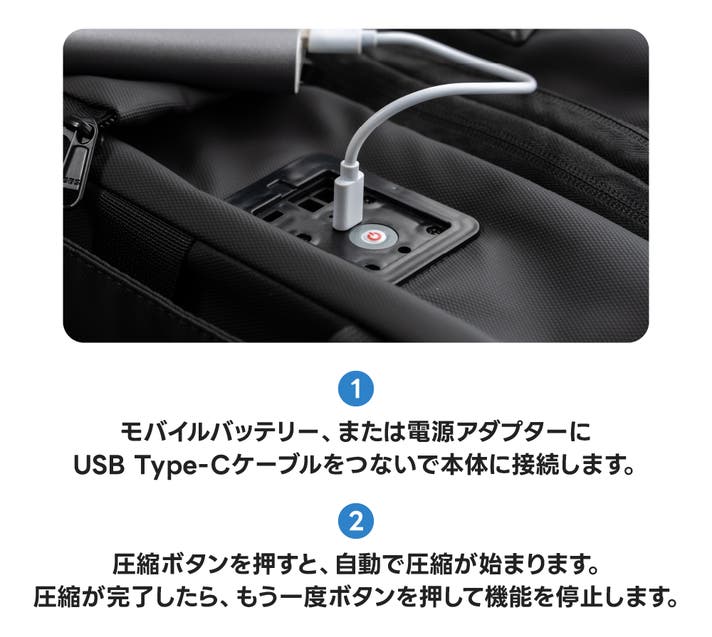 モバイルバッテリー、または電源アダプターにUSB Type-Cケーブルをつないでボタンを押すだけで、自動的に圧縮が始まります。