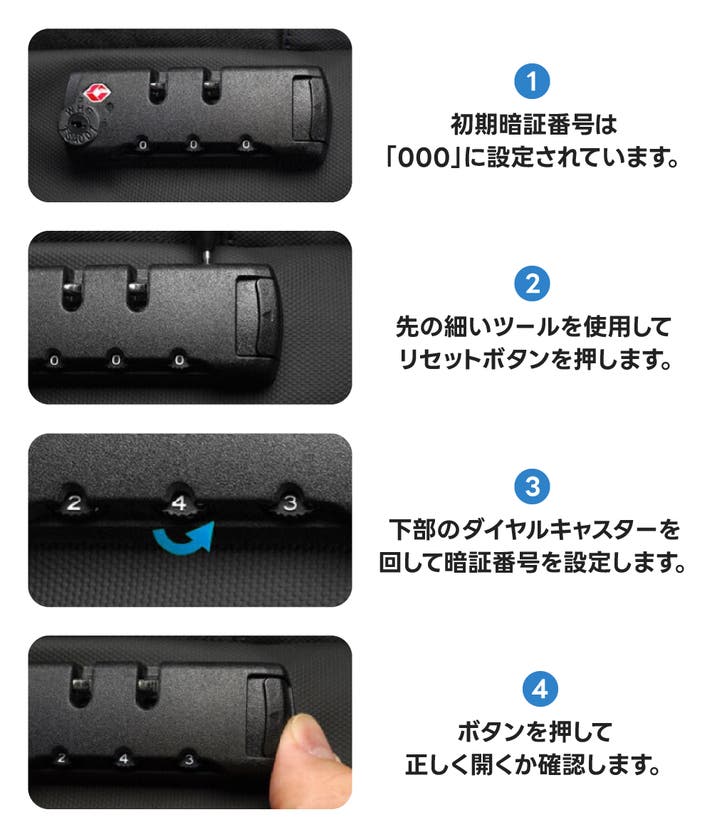 米国運輸保安局(TSA)認証のロックを採用しているため、空港のセキュリティ検査時でもマスターキーで開錠でき、ロックを破壊されることなく荷物検査が可能です。