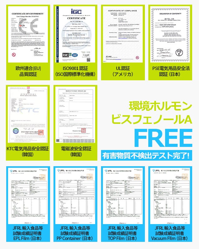 そして異なるフィルムを接着する際、一般的にドライラミネーション工法を適用しますが、「Lofaho 3 in 1プレミアム真空パック機」は「空気圧出工法」を適用しているので、フィルムに残っている有害成分(トルエン化学溶剤)を心配する必要がありません。