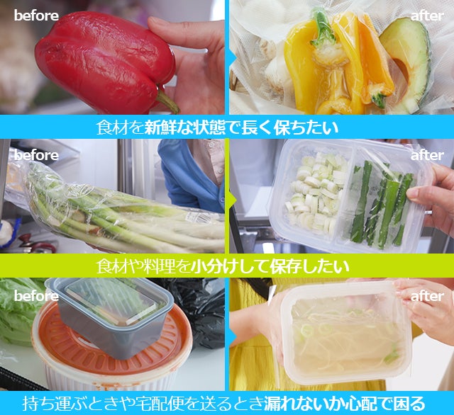 袋などにまとめて、冷蔵庫に入れておくと、鮮度が落ちてすぐに腐ってしまったり、変色して味が変わったりした経験ありますよね。お弁当やお汁などを持ち運ぶときも漏れないか心配で困りますよね。