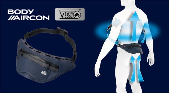 腰に巻きつけてスイッチを入れれば、上着の中に送風開始。野外に持ち出せるエアコンです。