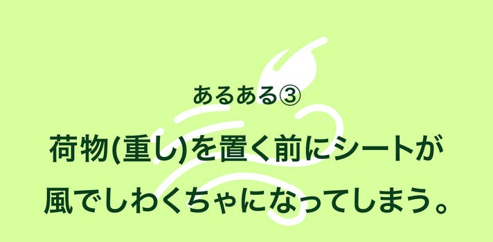 - 風で持ち上がりにくい性質を活かし、折り返して荷物を包めば簡易的な目隠しとしても使用で来ます。