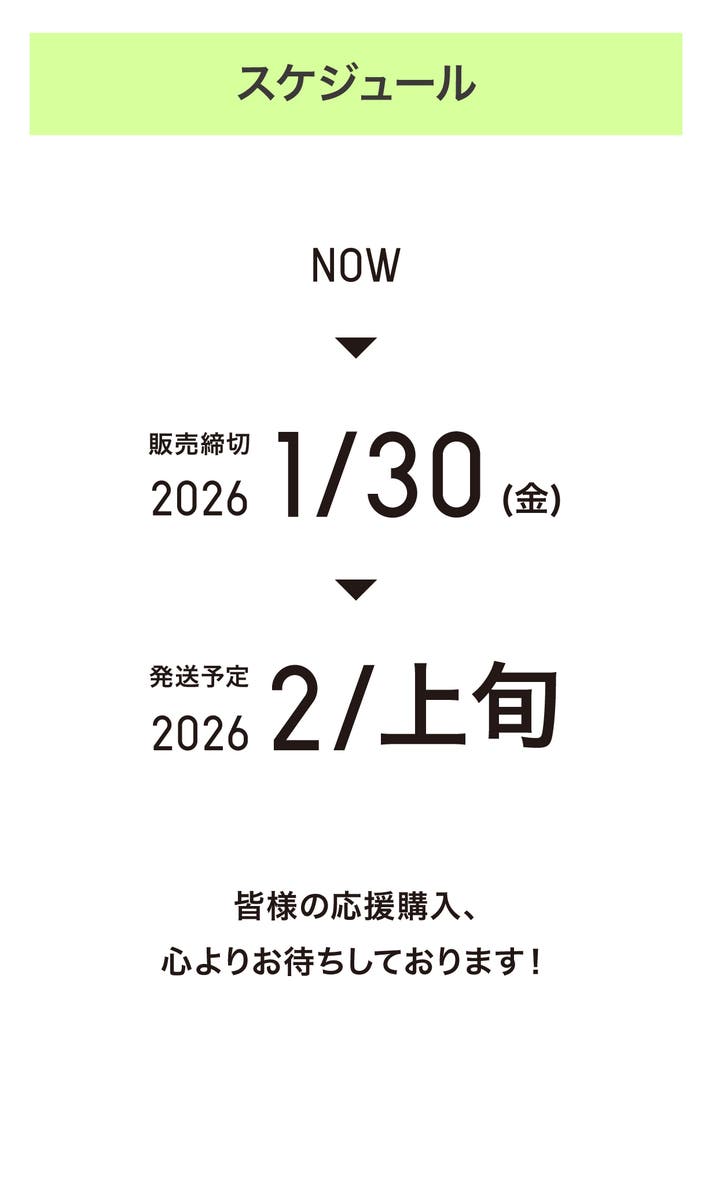 このプロジェクトはAll in型です。目標金額の達成に関わらず、プロジェクト終了日の2026年01月30日までに支払いを完了した時点で購入が成立します。
