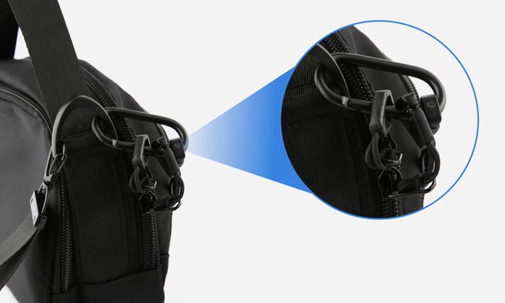 旅行や外出で必須の機能。盗難防止カラビナが標準で付属し、ファスナーをしっかり固定できます。人混みや観光地でも頼れる仕様。