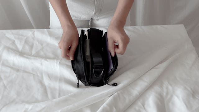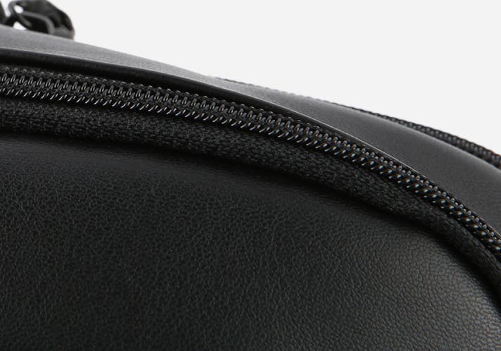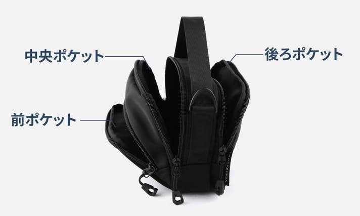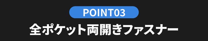 左利き・右利きのどちらでも使いやすいように、中央ポケットと後ろポケットは両開きファスナーで設計されています。