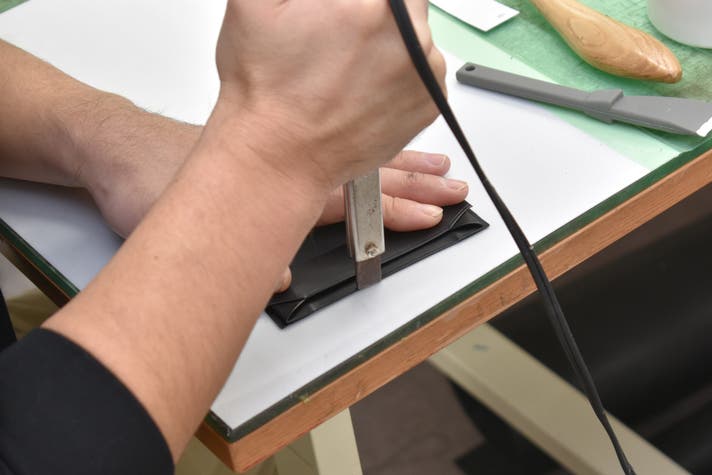 「風琴マチ」は、通常の「蛇腹マチ」よりも多くの型紙が必要となる上に、0.1mm単位での革の漉きの調整が必要なだけでなく、裁断を精密に行う必要があるため、高度な技術と手間がかかります。そのため、大量生産には向かず、この技を伝承している工房もごくわずかとなっているのが現状。