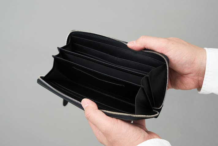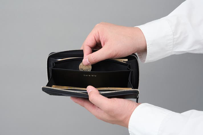 外側のラウンドファスナーを開けて、またコインスペースにもファスナーがついていると小銭の出し入れに手間がかかります。