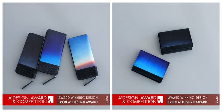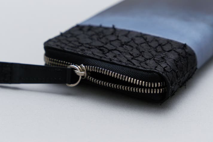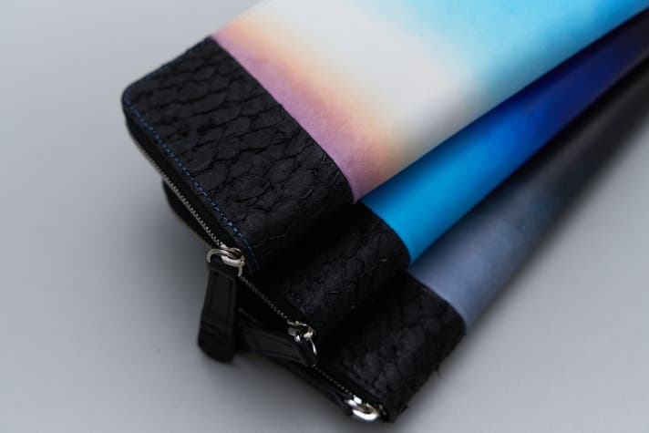 フィッシュレザーの鱗模様を「海の波」に見立て、グラデーションレザーを「変わりゆく空」に見立て、「水平線」を表現しました。