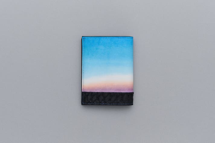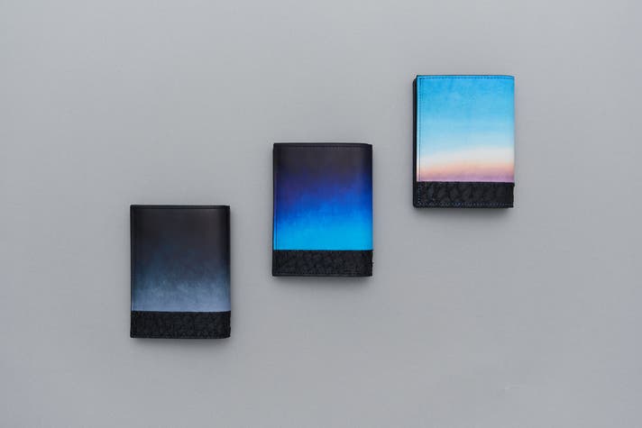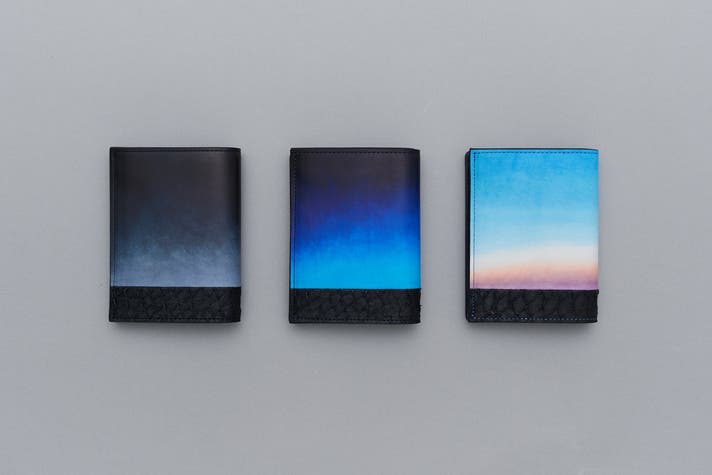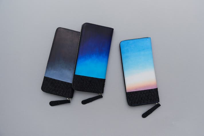 - 職人の手によって一枚一枚丁寧に染め上げた、手染めグラレーションレザーで「変わりゆく空」を描写。