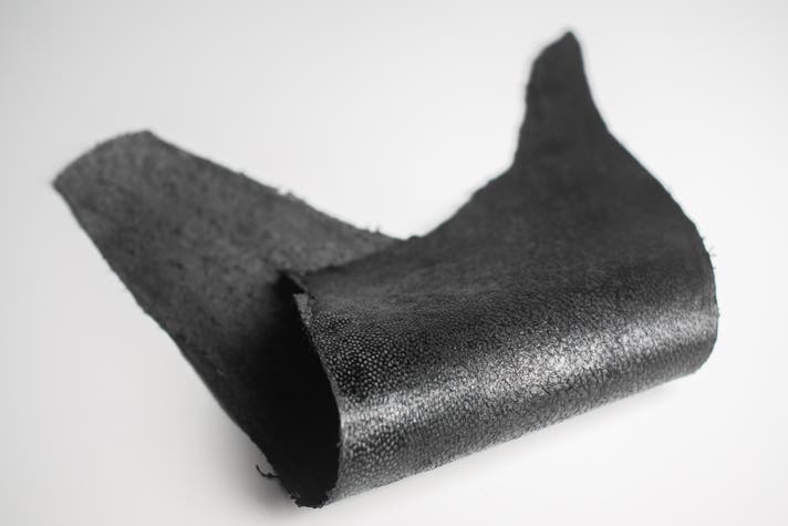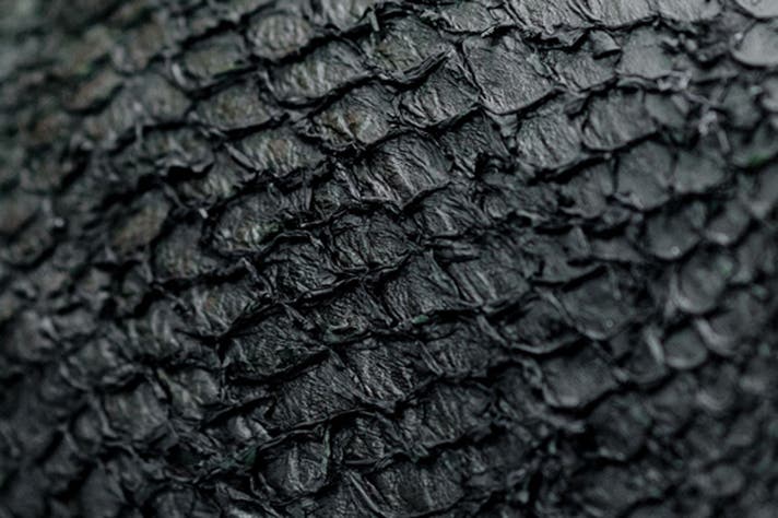 - 廃棄される鯛の皮をアップサイクル。一枚一枚なめしたフィッシュレザーの鱗模様で「海の波」を描写。