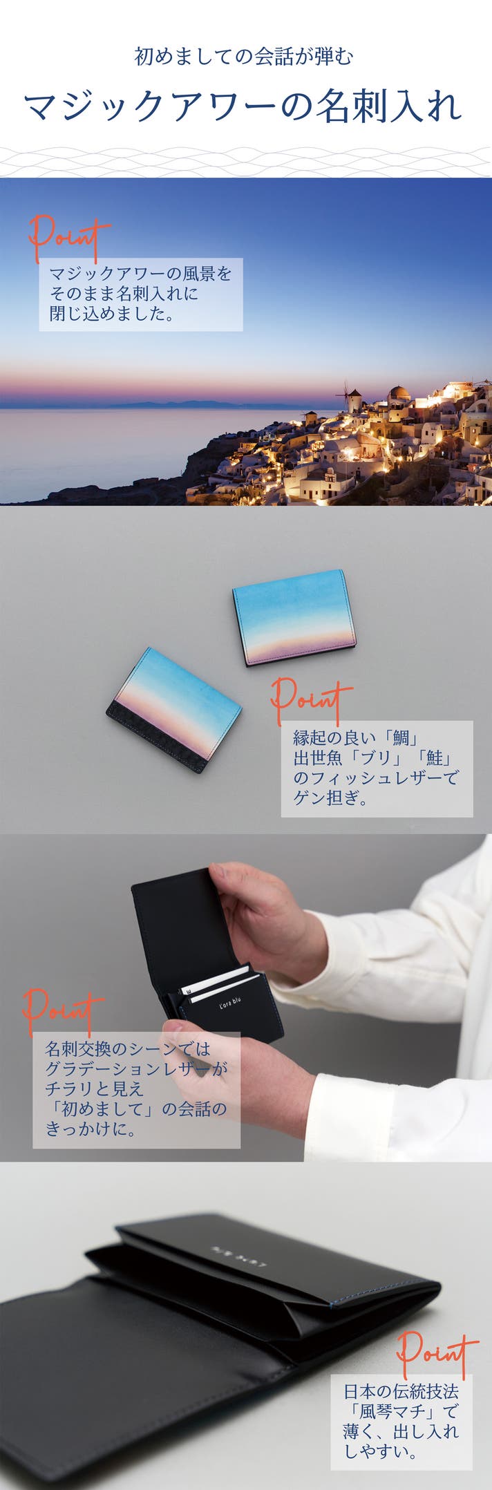 「美しいグラデーション」と「フィッシュレザー」で、「初めまして」の会話のきっかけになる名刺入れです。