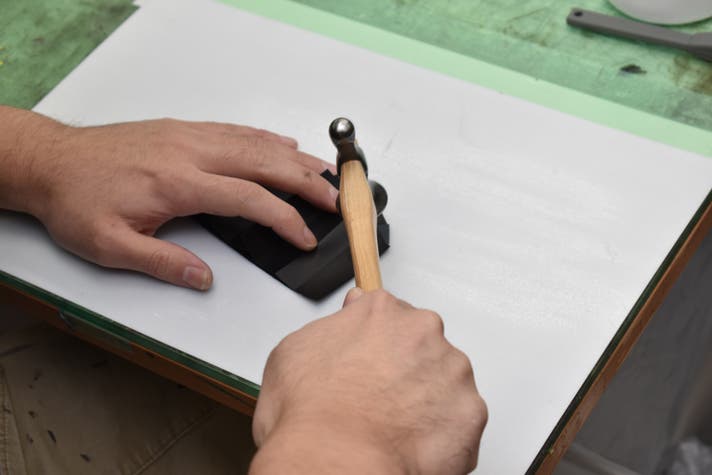 職人の手によって、姫路レザー(ステア)を一枚一枚丁寧に「変わりゆく空の色」をイメージしたグラデーションに染め上げました。「Cielo #02 名刺入れ」に使用するグラデーションレザーは小さいため、より繊細な作業が必要です。
