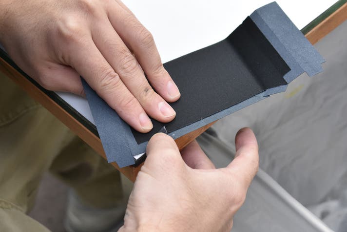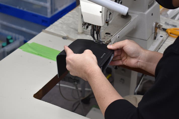 縫製した後に糸を切り軽く熱処理をするだけの工房も多いところ、ミシンで縫製した後、糸の結びこぶに糊をつけて、針穴に戻す「糊止め」という手間のかかる処理を施しています。