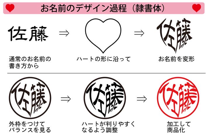 - [愛情=ハート]のインスピレーションから、お名前全体の形をハート型に収めました
