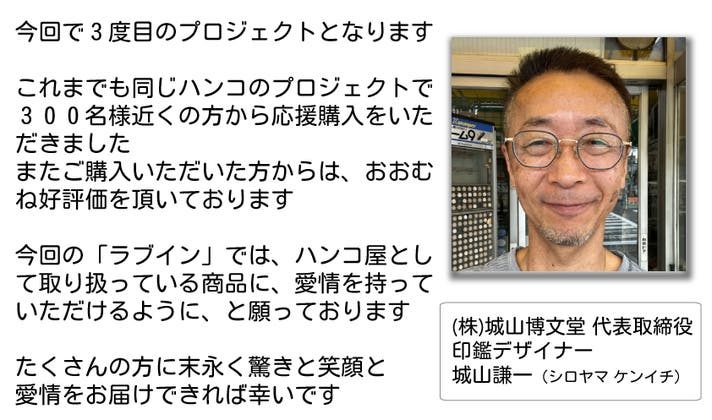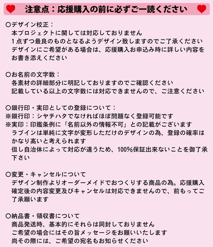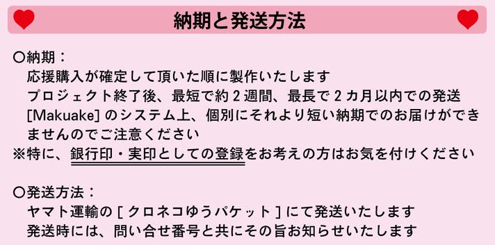 朱肉を使うタイプのハンコであれば、銀行印として登録可能です。 また印鑑証明の取得も問題ないと思われますが、細かな対応に関しては自治体によってまちまちなため、100%登録を保証するものではございません。 掲載している見本画像を窓口で見せて、登録できるか確認されることをお勧めいたします 商品のお届けは最短で、プロジェクト終了(10/30)後から約2週間後。 お申し込み順に作業発送いたします。(最終、本年12月末までに発送予定) 個別の急ぎ対応はできません。 銀行印・実印としての登録をお考えの場合には、その点お気を付けください。 応援購入の集中により対象商品の製作・お届けに予想以上の遅れが出る可能性が出た場合には、その時点でご報告させていただきます 商品のお届け後、お申し込みの内容と違っていた場合には、確認後無償で再制作・発送させていただきます またその際、間違っていた商品の返却は不要です 本文中に記載させていただいたスケジュールは、あくまでプロジェクト公開時点の予定です。 応援購入の性質上、配送遅延のおそれがございます。 原則として、配送遅延に伴う応援購入のキャンセルはできませんが、 リターン配送予定月から 3ヶ月 を超えた場合には、希望者に限りキャンセルにて対応させていただきます。