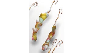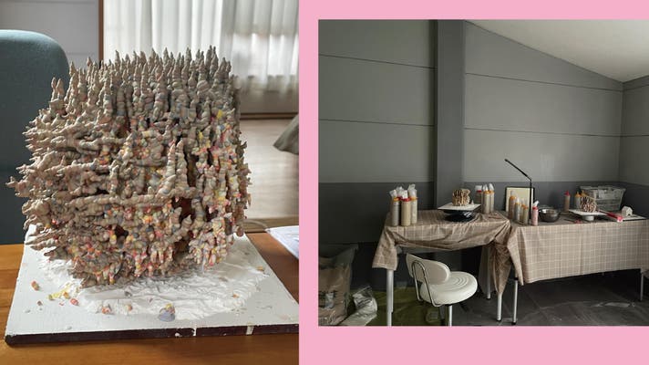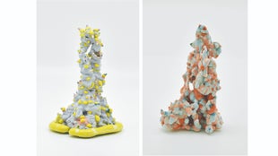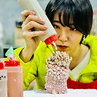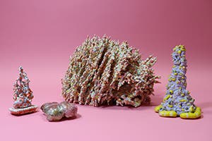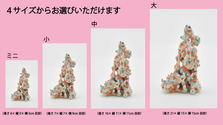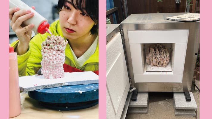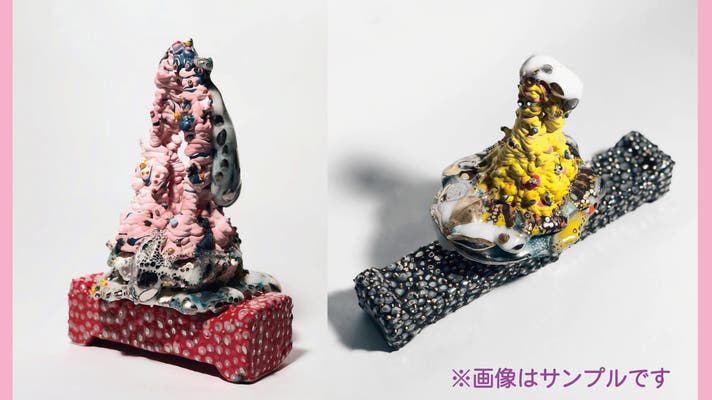 陶芸の新しい表現方法を探求しながら、カラフルなお菓子や珊瑚のような抽象作品を多く展開しています。多摩美術大学在学時から続けている自作の実験で生まれたオリジナル素材は数千種類に及びます。