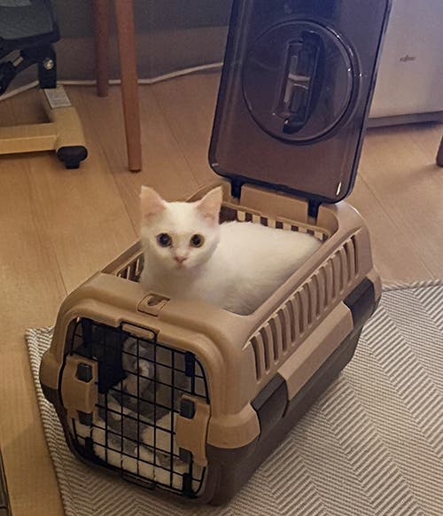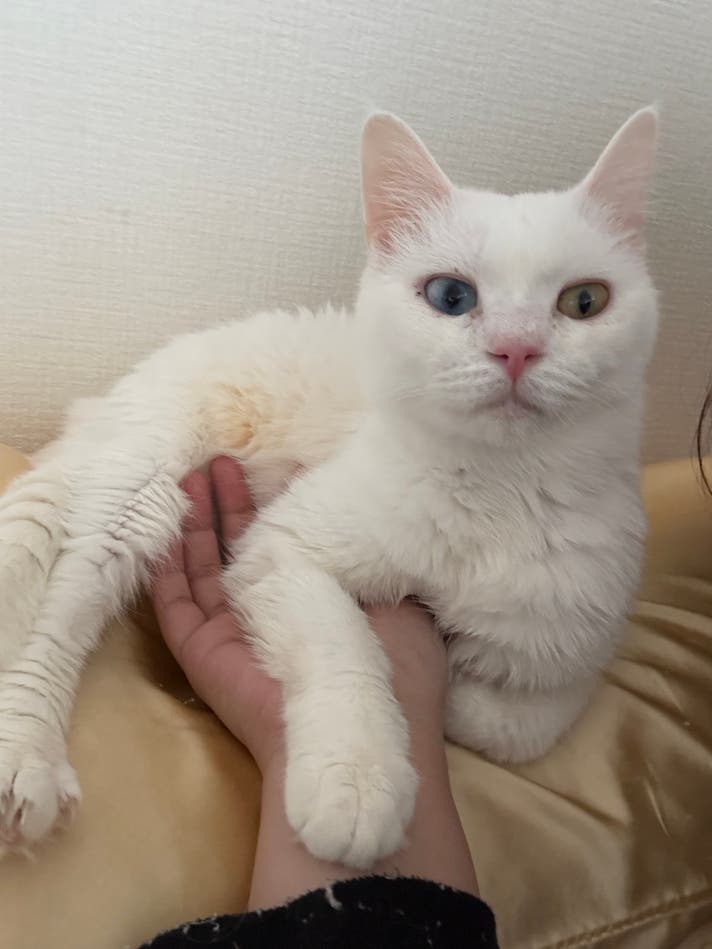 大変悲しい事に、レスキュー現場に70匹の猫がいたうち、生き残ったのは、たった14匹だけだったそうです。その生き残った14匹のうちの1匹である白猫オッドアイの美しい猫「エスケーツーちゃん」が我が家にやってくることになりました。
