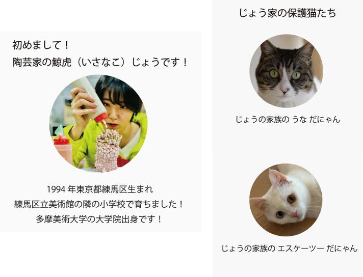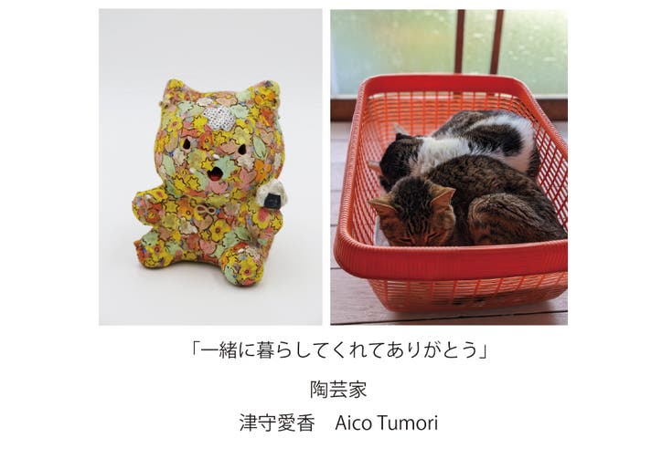 生まれた時から猫と暮らし、人間の家族を20代初期で全て亡くしてしまった経緯もあり、無二の家族である大切な保護猫ちゃんと一緒に陶芸をしながら暮らしてきました。人間の家族を亡くした時に猫ちゃんに心を支えてもらい日々大感謝しております。本職であるアートを通じて保護猫や猫関係への社会的な応援を頑張りたく、陶芸家をしながら、アートディレクター・キュレーターのお仕事もさせていただくようになりました。