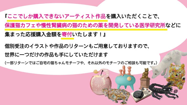 このプロジェクトを通じて、より多くの方に、猫のレスキューの現状や猫のかかりやすい病を知って頂くとともに、猫や動物や人への愛が深い素敵なアーティストの素敵なグッズを通じて猫の寄付に貢献する特別な愛の体験をしていただければ幸いです。