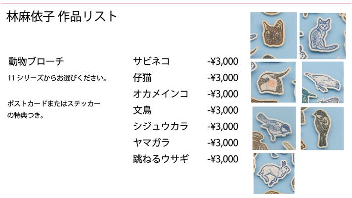 詩的な世界観の動物の陶芸作品で人気な陶芸家 林麻依子さんのアニマルブローチ/器が、プロジェクトオリジナルポストカードorステッカーの特典付きでお手に取っていただけることになりました!