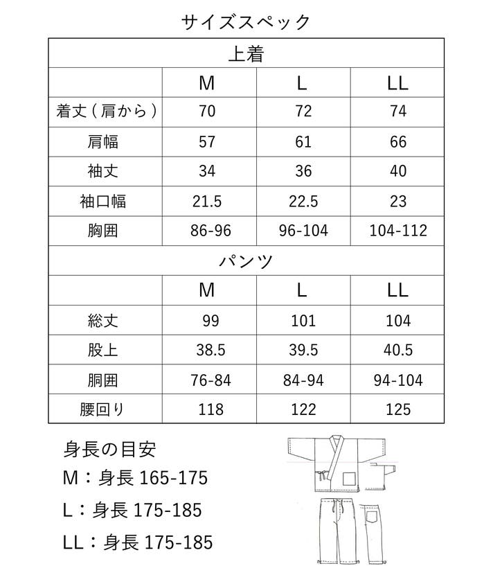 *デニム抜染作務衣、デニム作務衣(無地)ともに同サイズとなります。