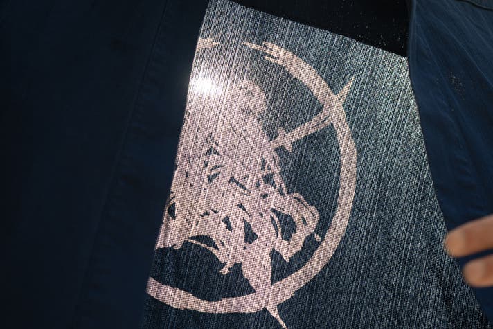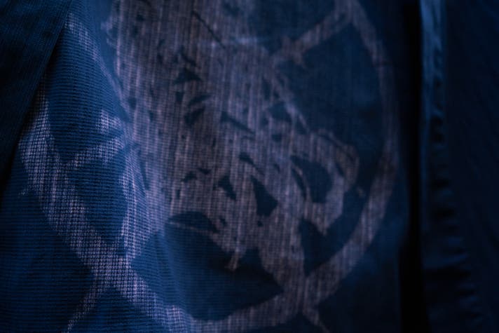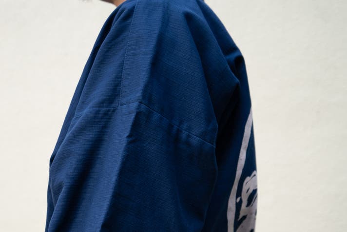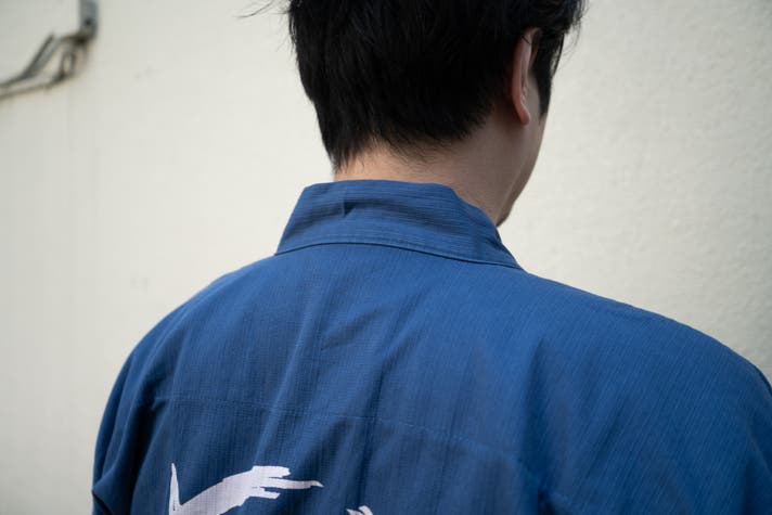 背中の紋は、手捺染で一つ一つ手作業で抜染しています。