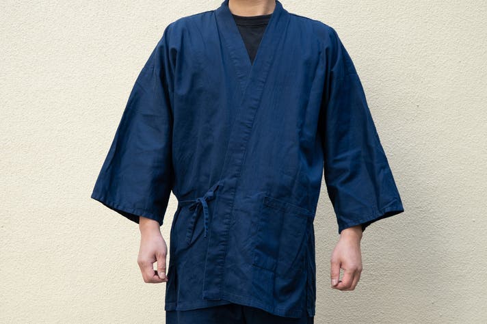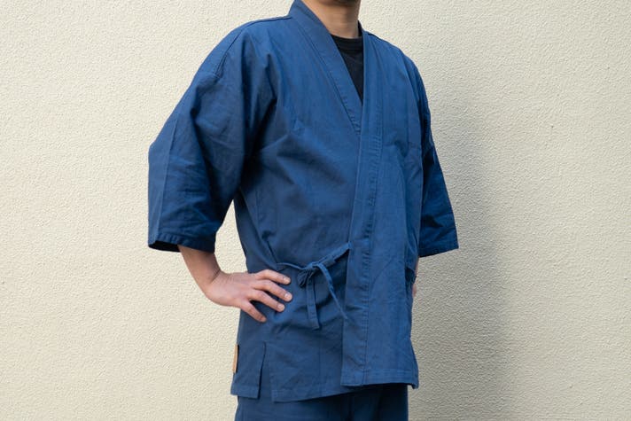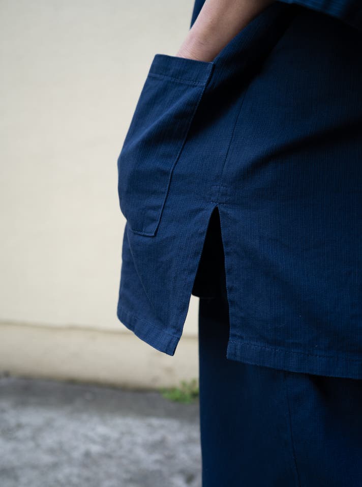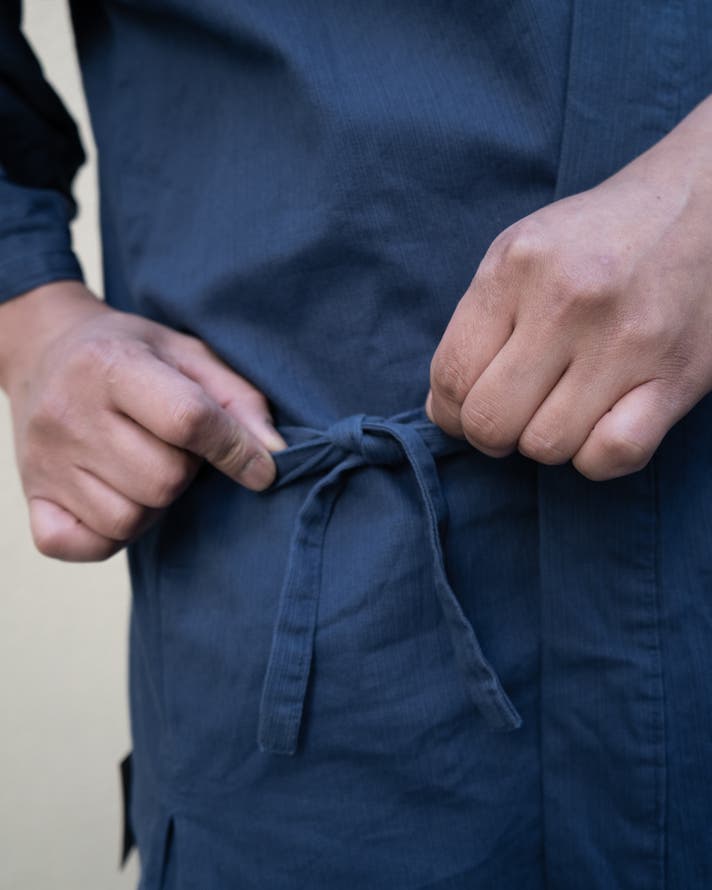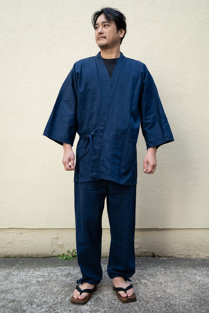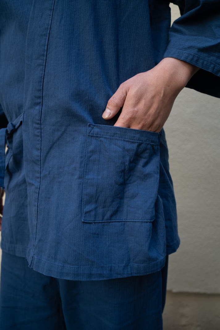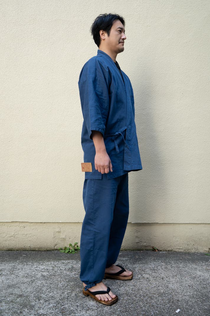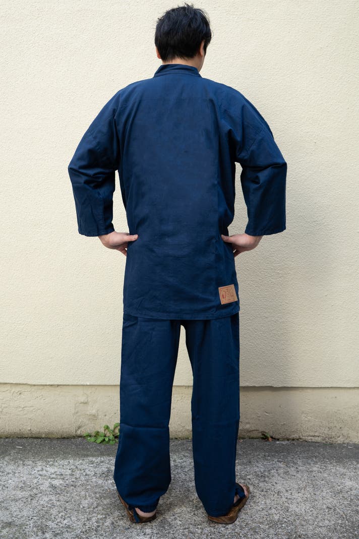 この生地の大きな特徴は、さっぱりとしたデニムで、日常に取り入れやすく、汗ばむ季節にも肌にまとわりつきにくい生地です。作業着としてもしっかり強度がありながら、生地はふんわりとした柔らかさがあり、肌あたりが優しいのでそのままくつろぎたくなる着心地です。体の形がきまるハリ感がありながらも、着心地抜群で非常に動きやすく快適です。染めの味わいも和特有の雰囲気も楽しんでいただけます 。