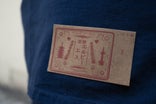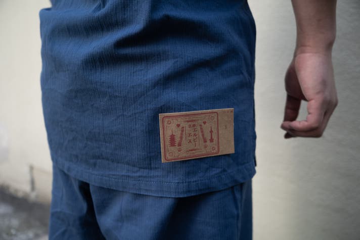 作務衣のために、ジーンズからイメージした紙パッチをロゴからオリジナルで作成しました。