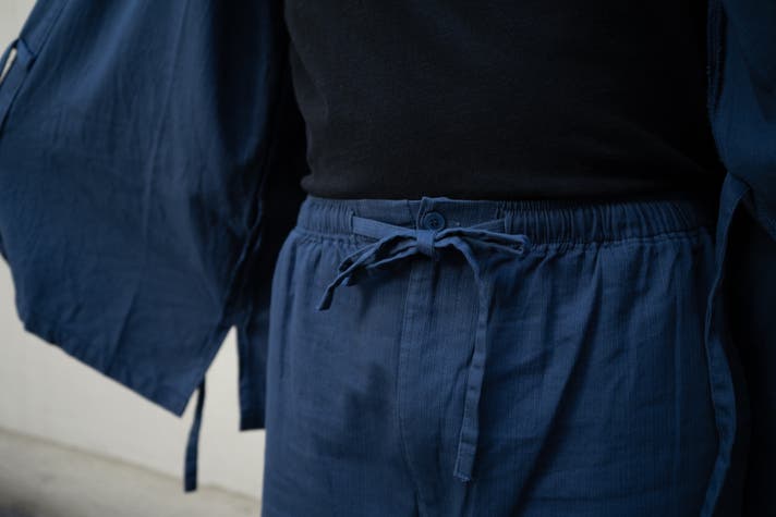 着物と違って作務衣は上下セパレートなので、最も簡単に着られる元祖セットアップなのです。また帯などの付属品を必要とせず、縫い付けの腰紐で結ぶだけなので体を締め付けず着脱も簡単です。