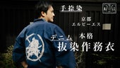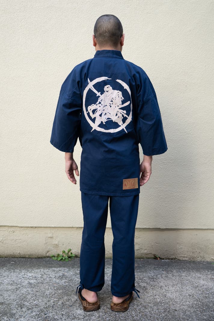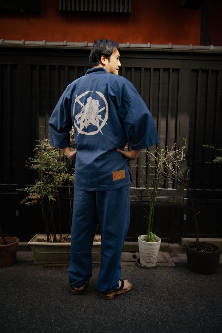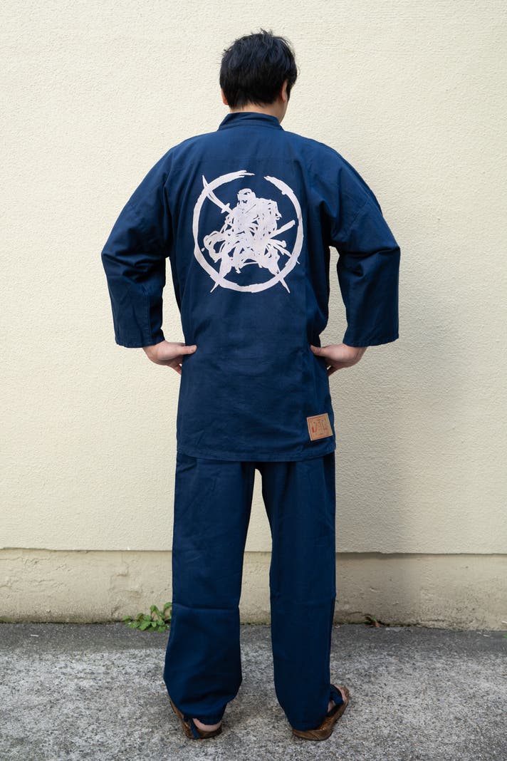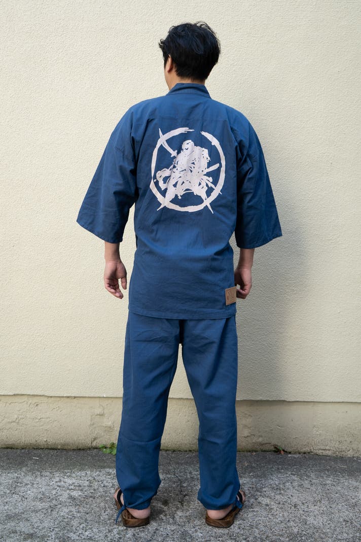 京都で仕上げる本格作務衣、手捺染のデニム抜染作務衣