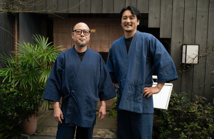 - 通年着られる本格デニム作務衣【先行限定120着】の京都職人の手捺染加工入りと選べる無地作務衣