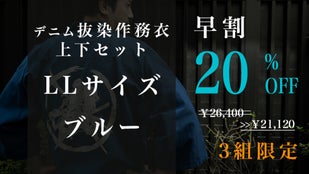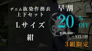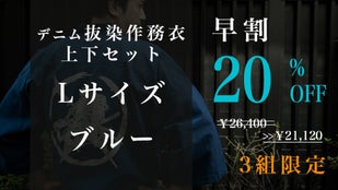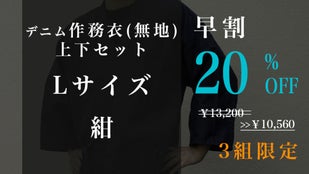 早割「先行販売3組」デニム抜染作務衣1組【ブルーL】20%OFF