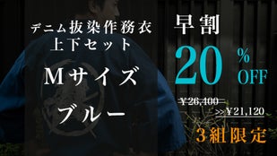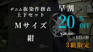 早割「先行販売3組」デニム抜染作務衣1組【ブルーM】20%OFF