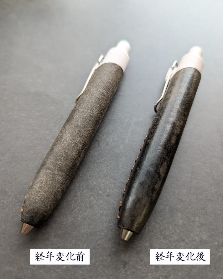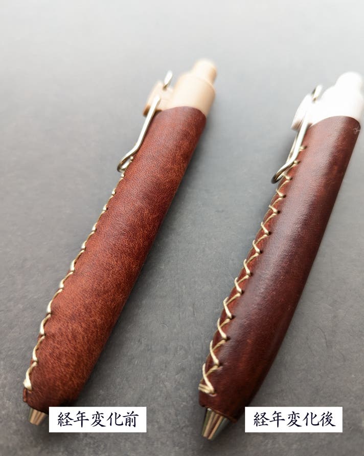 ペンに本革をまとわせて、書けば書くほど経年変化を楽しめる。