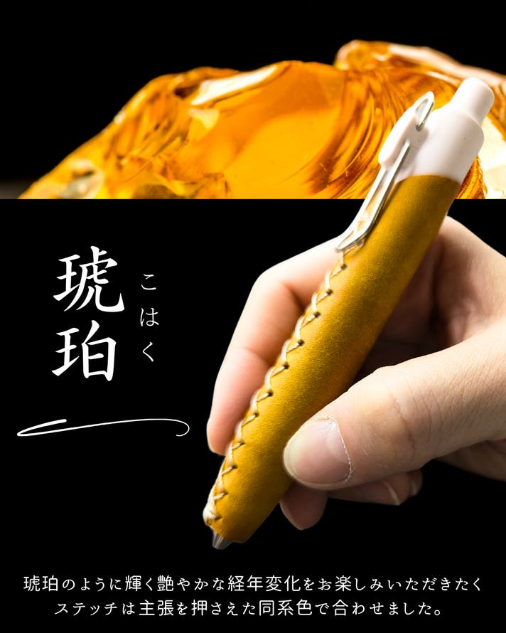 ペンに本革をまとわせて、書けば書くほど経年変化を楽しめる。