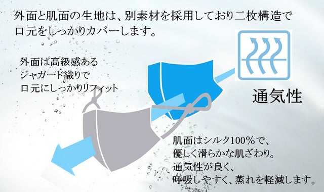 ①肌に優しい素材をとことん追求!口肌面は天然素材シルクを採用!