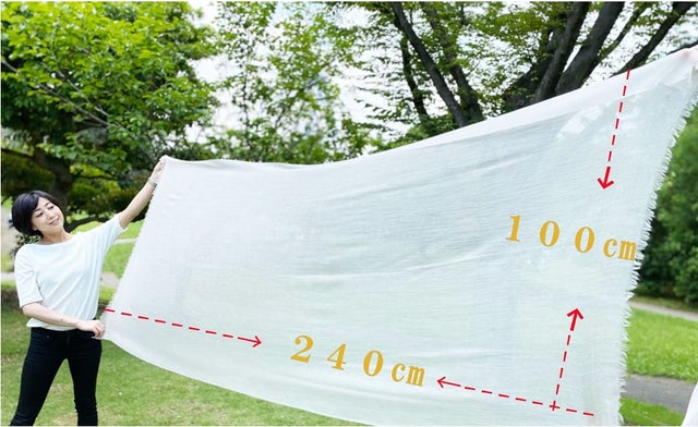 超軽量でありながら、商品サイズは240cm×100cmと大きめの設計であることも嬉しいポイントの一つ。色々な巻き方で楽しめるサイズです。