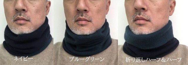 首廻はネックウォーマー。マフラータイプだとゴルフ、サイクリング、スキー、スノボ、キャンプ、釣りしたり、アクティブな動きをする時に、巻きが緩んだり、外れたりしますよね。ネックウォーマーですとその心配は不要。首に通せば、緩み、外れの心配はありません。首にかければ瞬時に暖かさを感じます。
