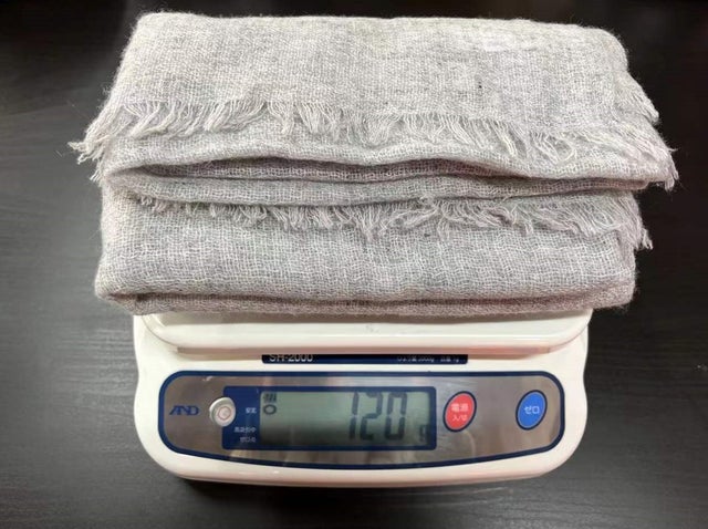 ここからが本題です。糸を太くすれば切れない丈夫な糸が作られ、織るときにも切れないですね。今回、ふわふわ、もふもふ感を出すには、太い糸では作ることが出来ません。そこで、細い糸を作り、そこに織機に耐えるように水に溶ける糸をカシミヤ細い糸に巻き付けて、しっかりさせて織る手間をかけ、技術を掛けた方法です。